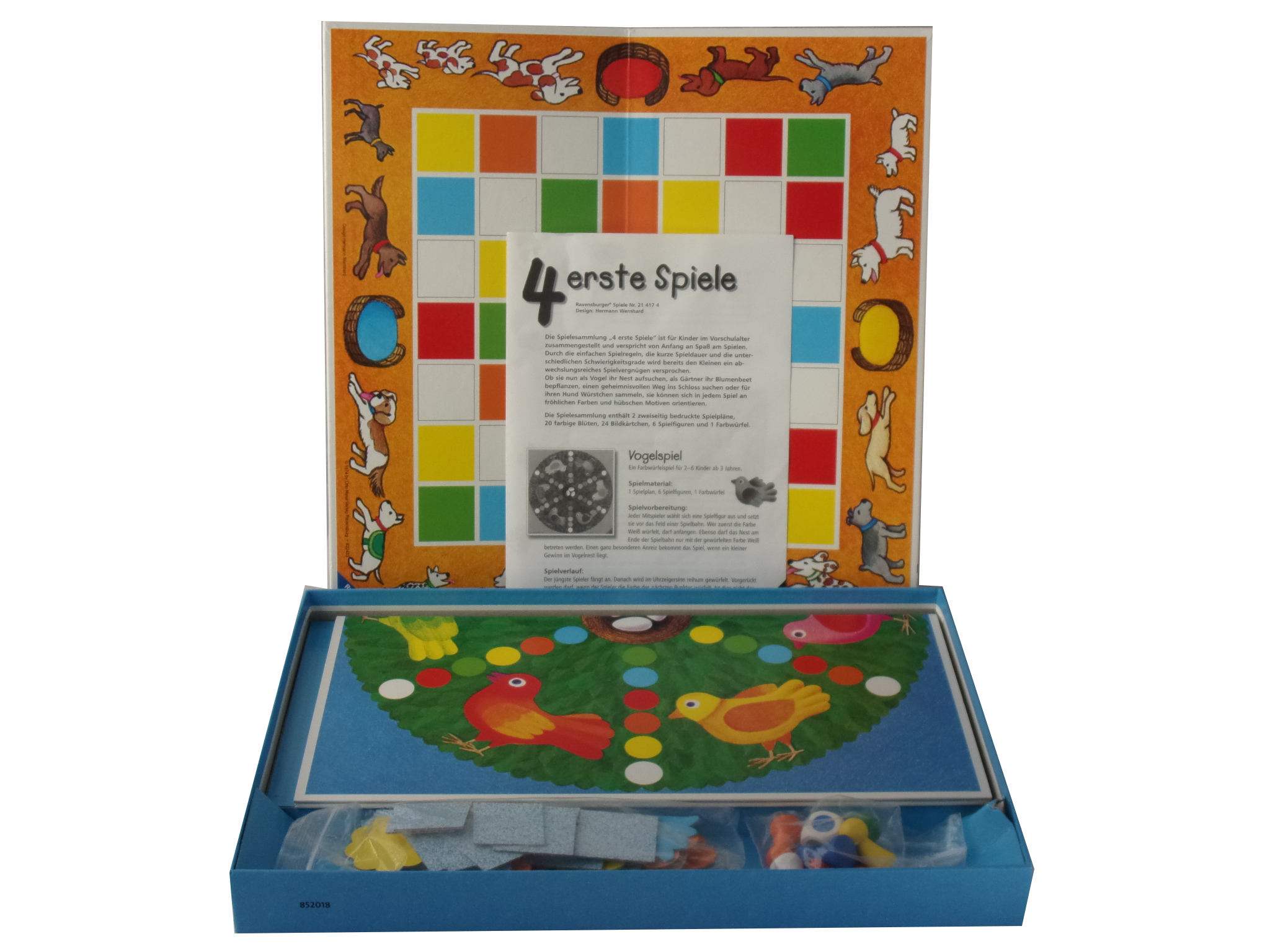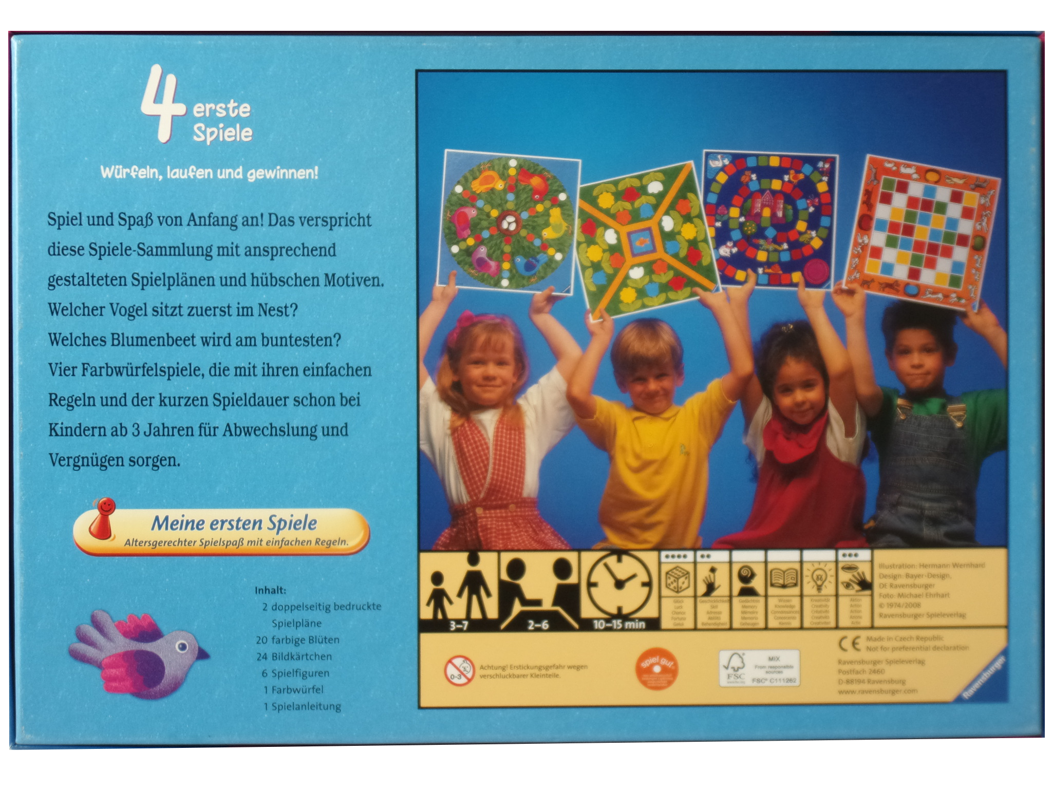 Spiel und Spaß von Anfang an! Das verspricht diese Spiele-Sammlung mit ansprechend gestalteten Spielplänen und hübschen Motiven. Welcher Vogel sitzt zuerst im Nest? Welches Blumenbeet wird am buntesten? Vier Farbwürfelspiele, die mit ihren einfachen Regeln und der kurzen Spieldauer schon bei Kindern ab 3 jahren für Abwechslung und Vergnügen sorgen.