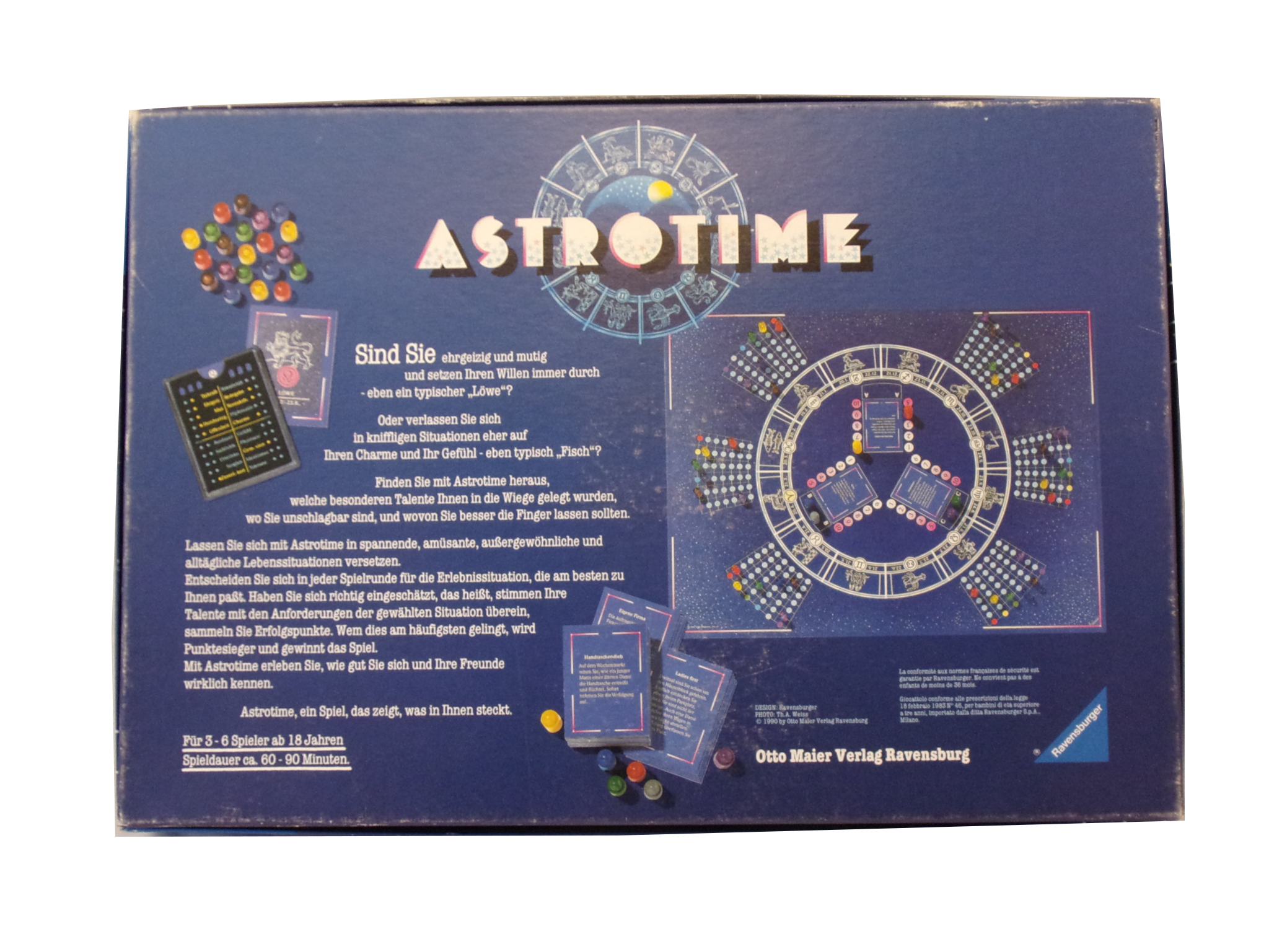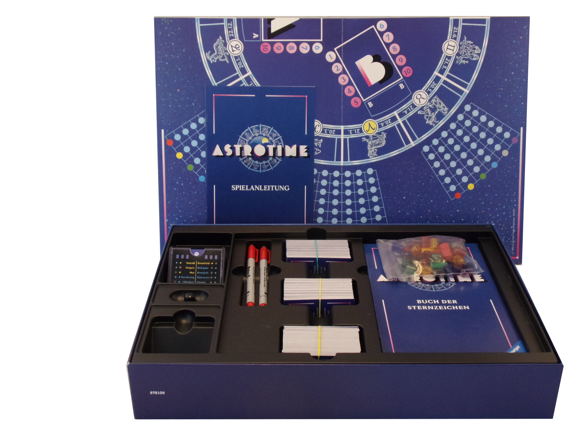 1 Astrostein, 6 Spielfiguren, 1 Spielplan, 36 Erfolgssteine, 384 Karten, 6 Spieltableaus aus Kunststoff, 2 Stifte (fehlen) 12 Sternzeichenkarten, 1 Spielbrett, 1 Spielanleitung (DE)