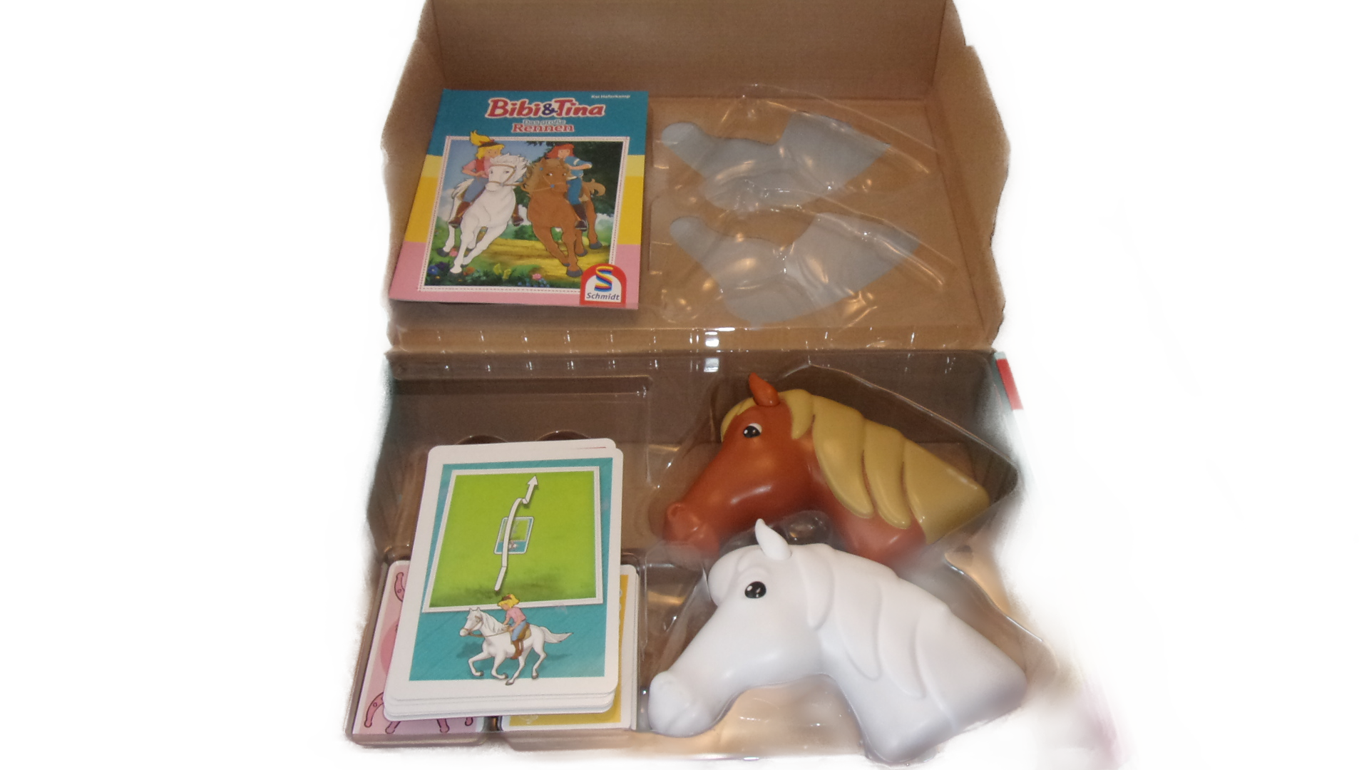 2 Steckenpferde (zusammensteckbar), 12 Parcours-Karten, 12 Symbol-Karten, 40 Quoiz-Karten, 1 Spielanleitung (DE)