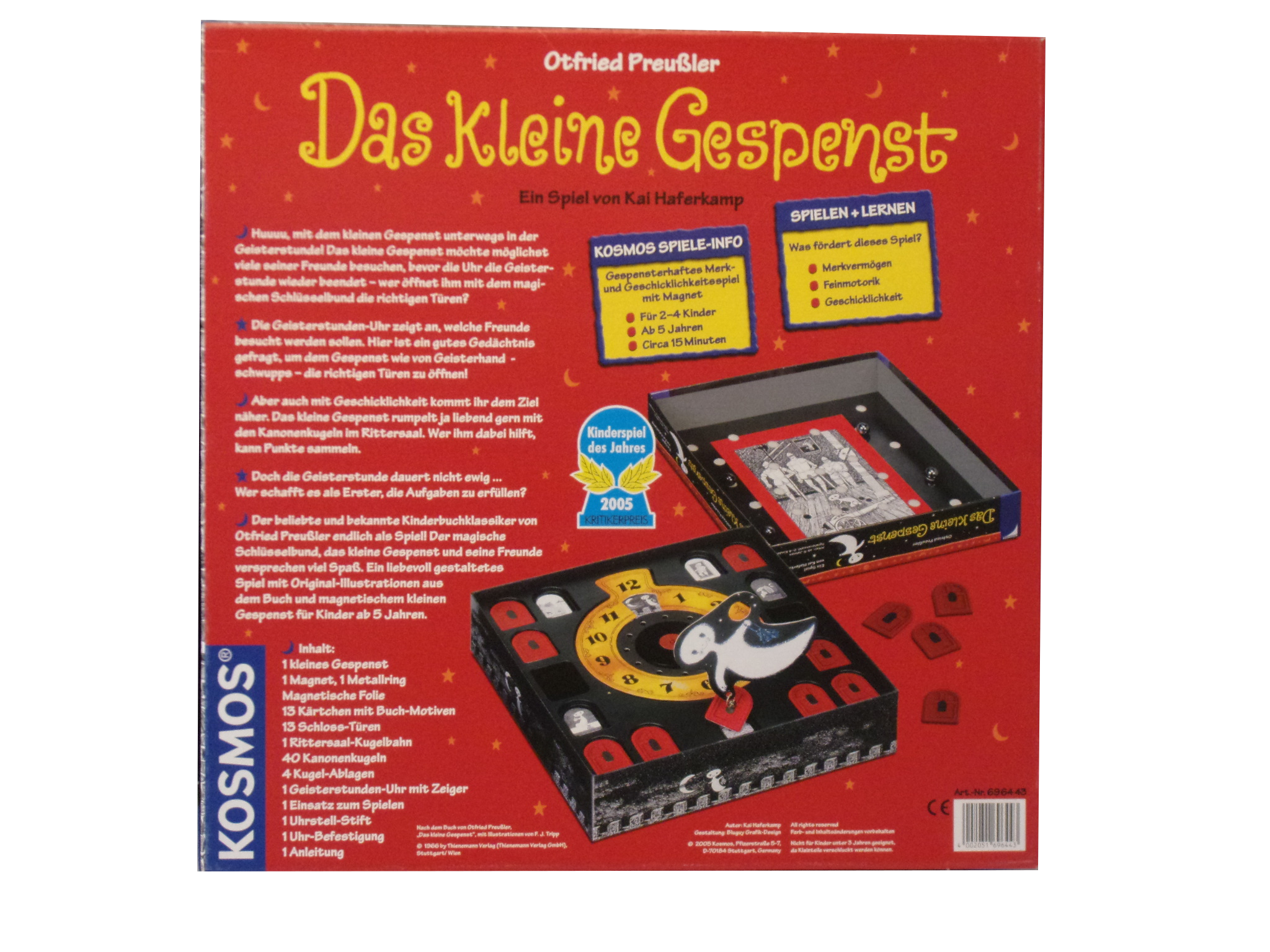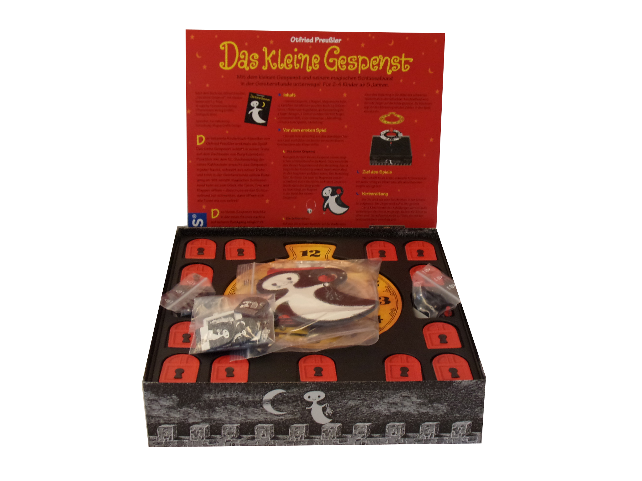 1 kleines Gespenst, 1 magnet, 1 Metallring, Magnetische Folie, 13 Kärtchen mit Buch-Motiv, 13 Schloss-Türen, 1 Rittersaal-Kugelbahn, 40 Kanonenkugeln, 1 Geisterstunden-Uhr mit Zeiger, 1 Einsatz zum Spielen, 1 Uhrstell-Stift, 1 Uhr Befestigung, 1 Spielanleitung (DE)