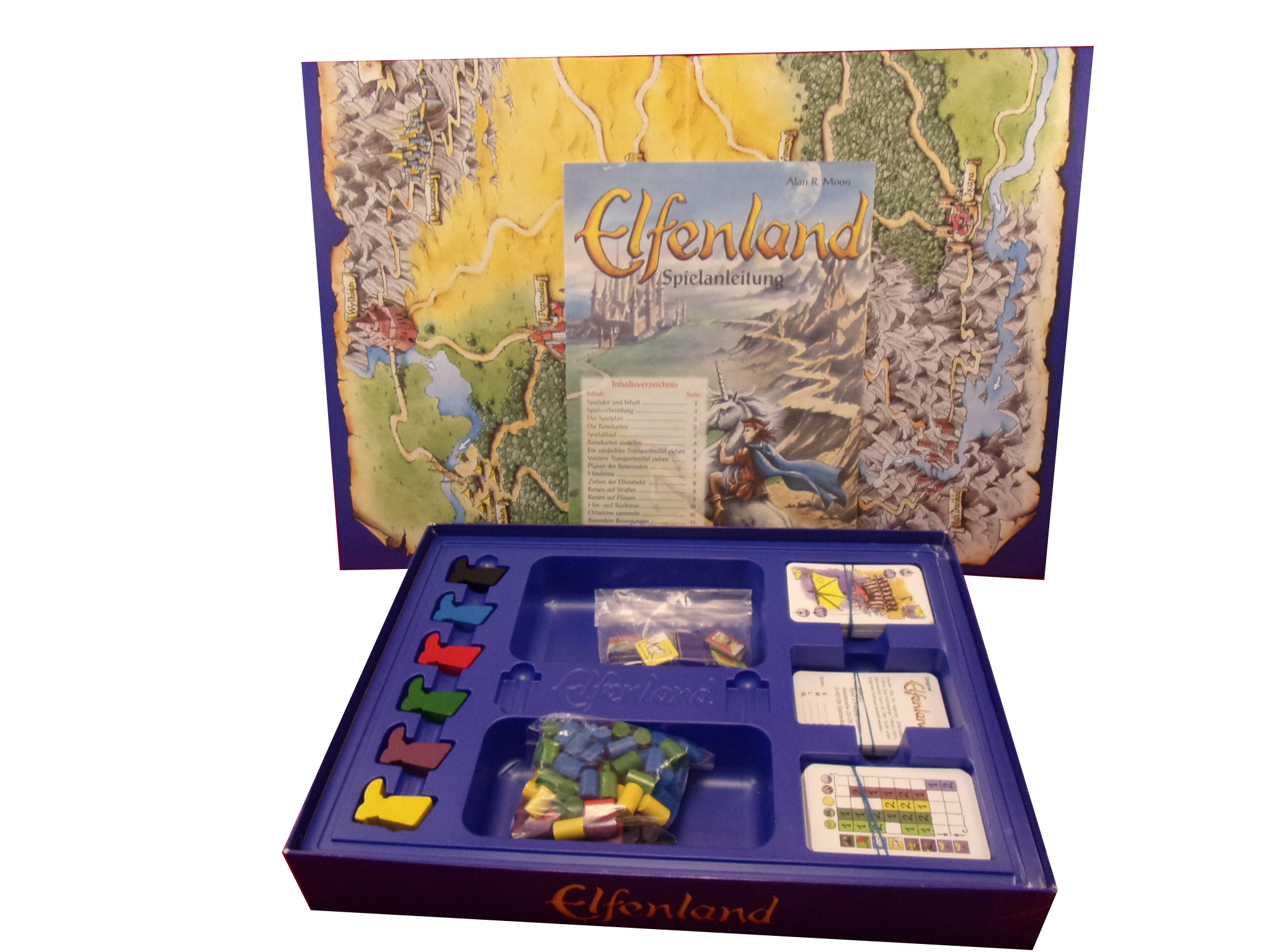 120 Ortssteine, 72 Reisekarten, 12 Ortskarten, 6 Elfenstiefel, 6 Übersichtskarten, 6 Hindernisse, 4 Rundenkarten, 1 Startspielerkarte, 1 Spielplan, 1 Anleitung (DE)