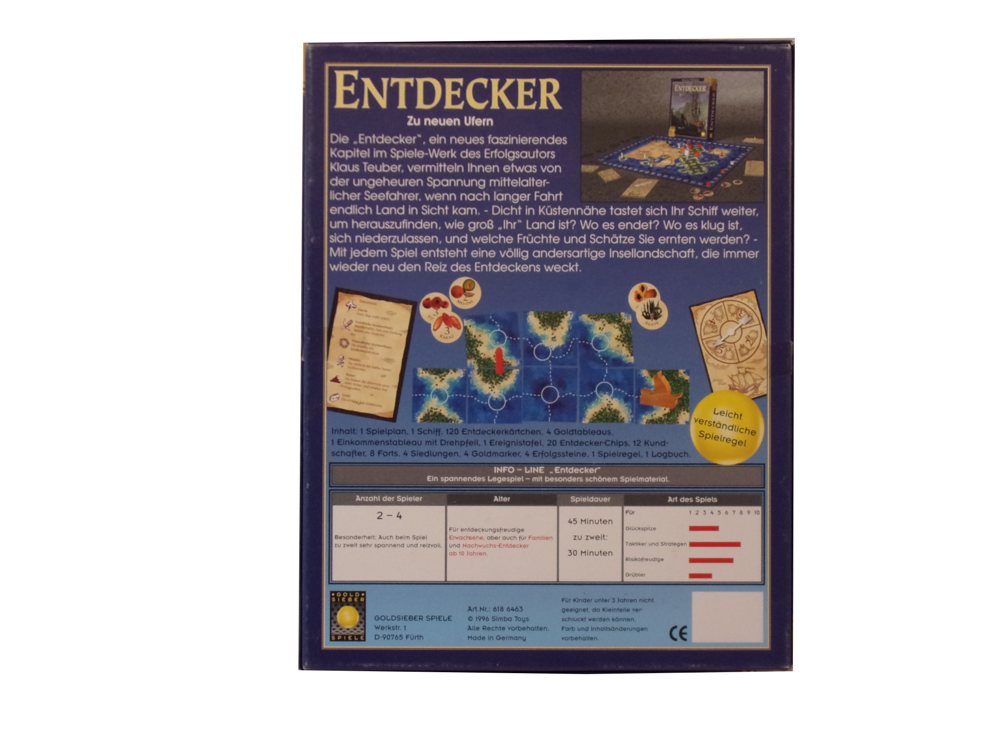Die „Entdecker", ein neues faszinierendes Kapitel im Spiele Werk des Erfolgsautors Klaus Teuber, vermitteln Ihnen etwas von der ungeheuren Spannung mittelalterlicher Seefahrer, wenn nach langer Fahrt endlich Land in Sicht kam. - Dicht in Küstennähe tastet sich ihr Schiff weiter, um herauszufinden, wie groß „IHR" Land ist? Wo es endet? Wo es klug ist, sich nierderzulassen, und welche Früchte und Schätze Sie ernten werden? - Mit jedem Spiel entsteht eine völlig andersartige Insellandschaft, die immer wieder neu den Reiz des Entdeckens weckt.