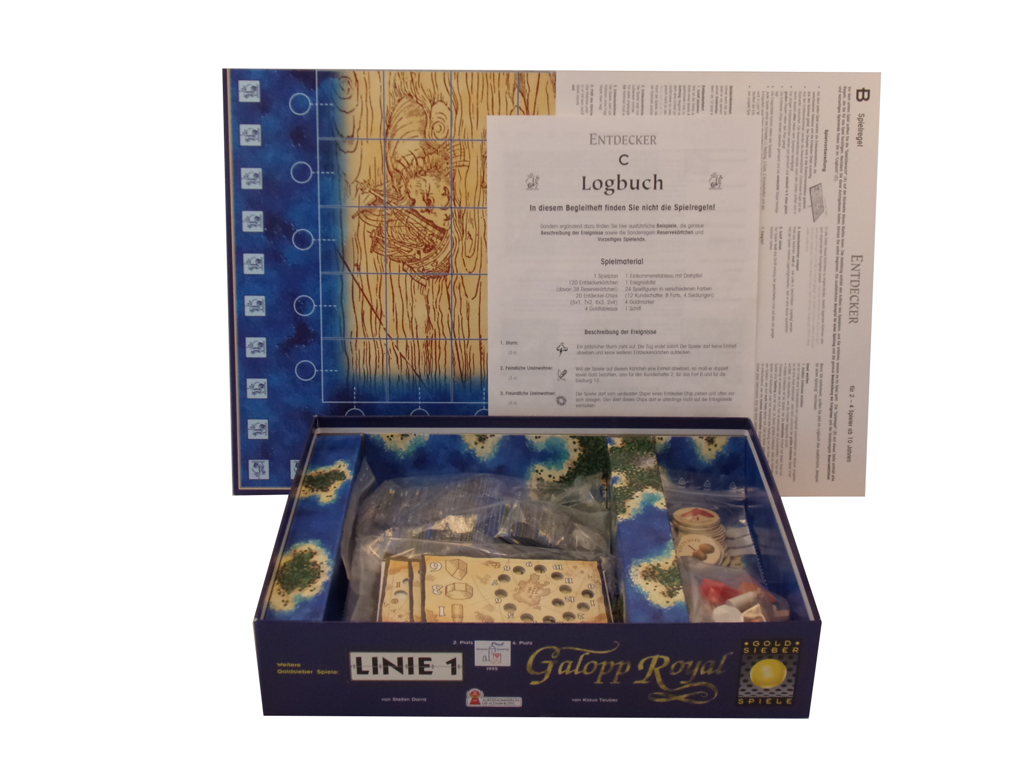 1 Spielplan, 1 Schiff, 120 Entdeckerkärtchen, 4 Goldtableaus, 1 Einkommenstableau mit Drehpfeil, 1 Ereignistafel, 20 Entdecker-Chips, 12 Kundschafter, 8 Forts, 4 Siedlungen, 4 Goldmarker, 4 Erfolgssteine,1 Spielanleitung (DE), 1 Logbuch