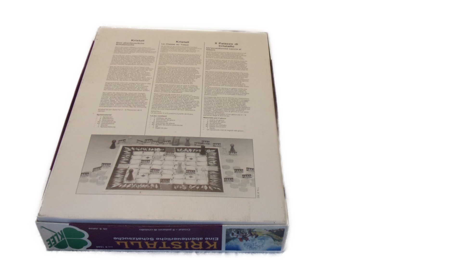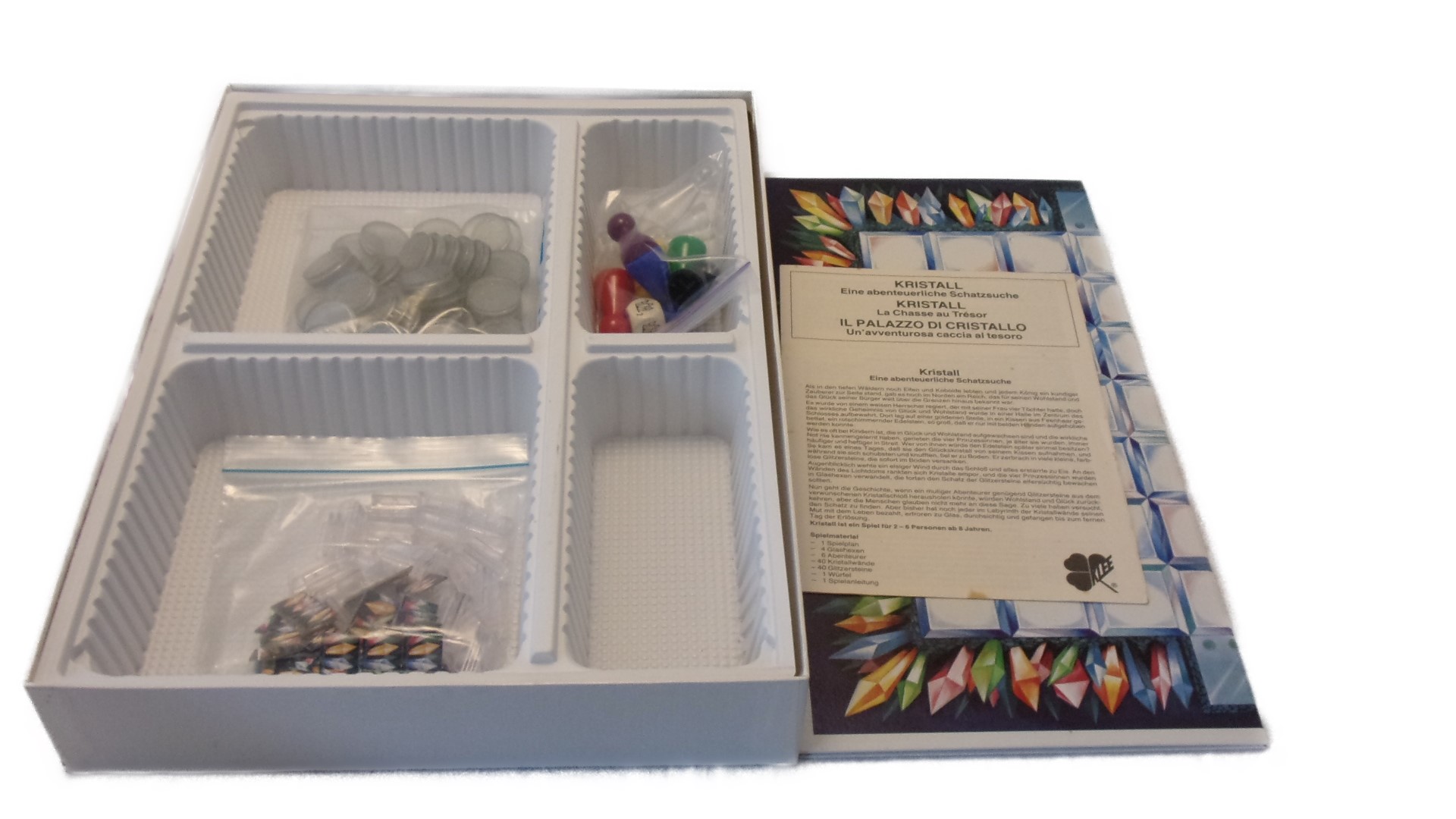 1 Spielplan, 4 Glashexen, 6 Abenteurer, 40 Kristallwände, 40 Glitzersteine, 1 Würfel, 1 Spielanleitung