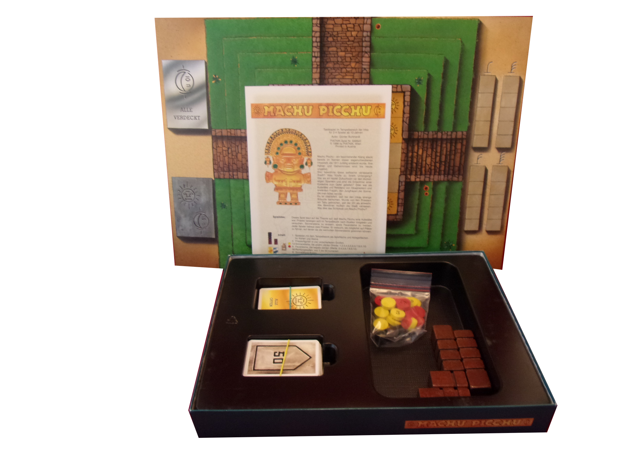 1 Spielplan, 4 Priesterfiguren aus Holz, 1 Hohepriesterfigur, 12 Sonnensteine, 8 Feuersteine, 5 Aufgabekarten, 50 Richtungskarten, 8 Sonne/Mondkarten, 1 Spielanleitung (DE)