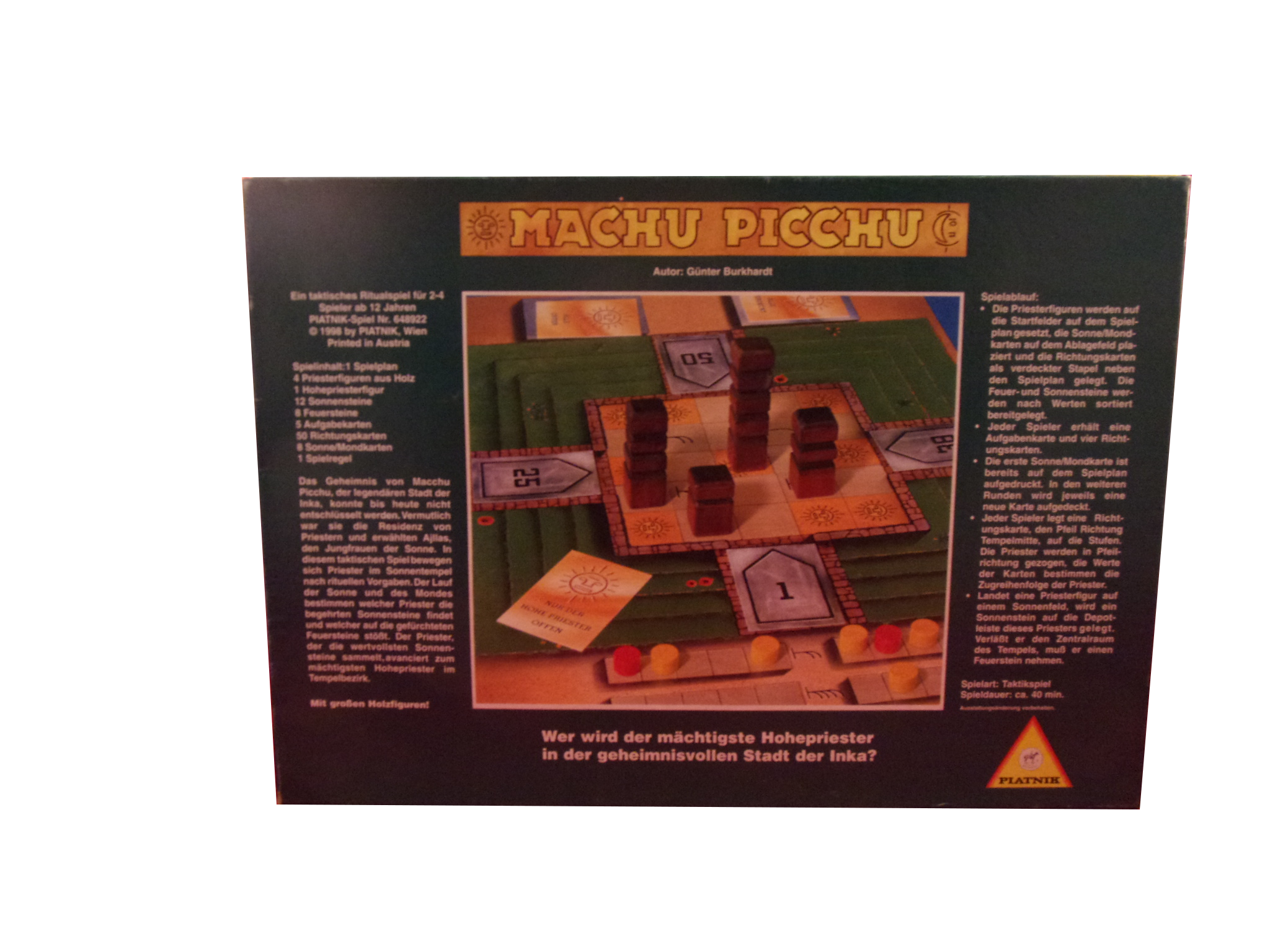 Das Geheimnis von Machu Picchu, der legendären Stadt der Inka, konnte bis heute nicht entschlüsselt werden. Vermutlich war sie die Residenz von Priestern und erwählten Ajllas, den Jungfrauen der Sonne. In diesem tatischem Spiel bewegen sich Priester im Sonnentempel nach rituellen Vorgaben. Der Lauf der Sonne und des Mondes bestimmen welcher Priester die begehrten Sonnensteine findet und welcher auf die gefürchteten Feuersteine stößt. Der Priester, der die wertvollsten Sonnensteine sammelt, avanciert zum mächtigsten Hohepriester im Tempelbezirk.