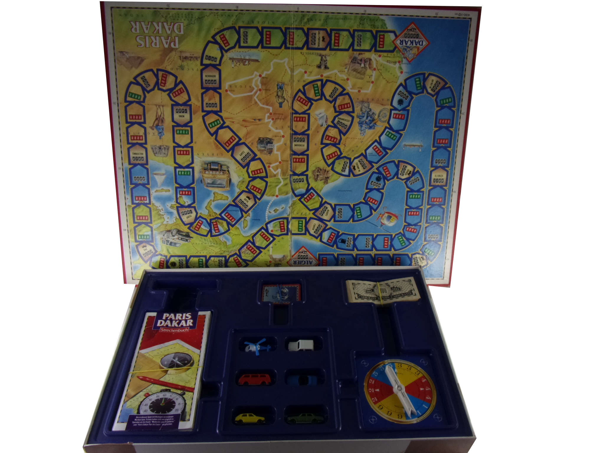 1 Spielbrett, Drehscheibe mit Pfeil, 12 Pannen-Karten, 1 Pannenhilfe-Wagen Karte, 1 Flugambulanz-Karte, 4 Wettbewerbsfahrzeuge, 1 weißer Pannenhilfe-Wagen, 1 Hubschrauber, 40 Wertsteinea 100 Liter Benzin, 50 Wertsteine a 20 Liter Benzin, 4 Streckenbücher, 1 Spielanleitung (DE)