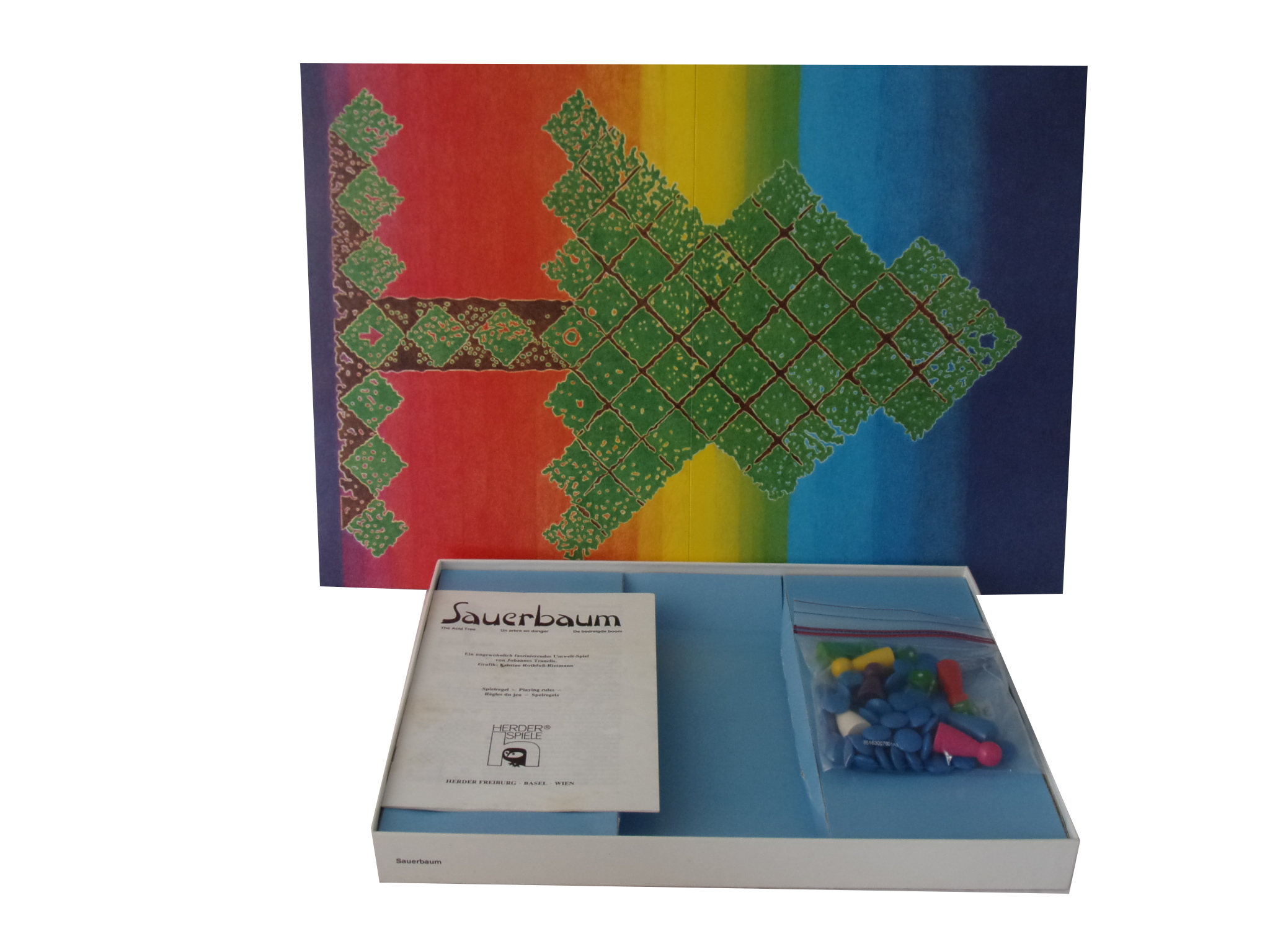 1 Spielplan, 60 Regentropfen-Spielsteine, 1 blauer und 3 grüne Würfel, 7 Spielfiguren, 1 Spielanleitung (DE,EN,FR,NL)